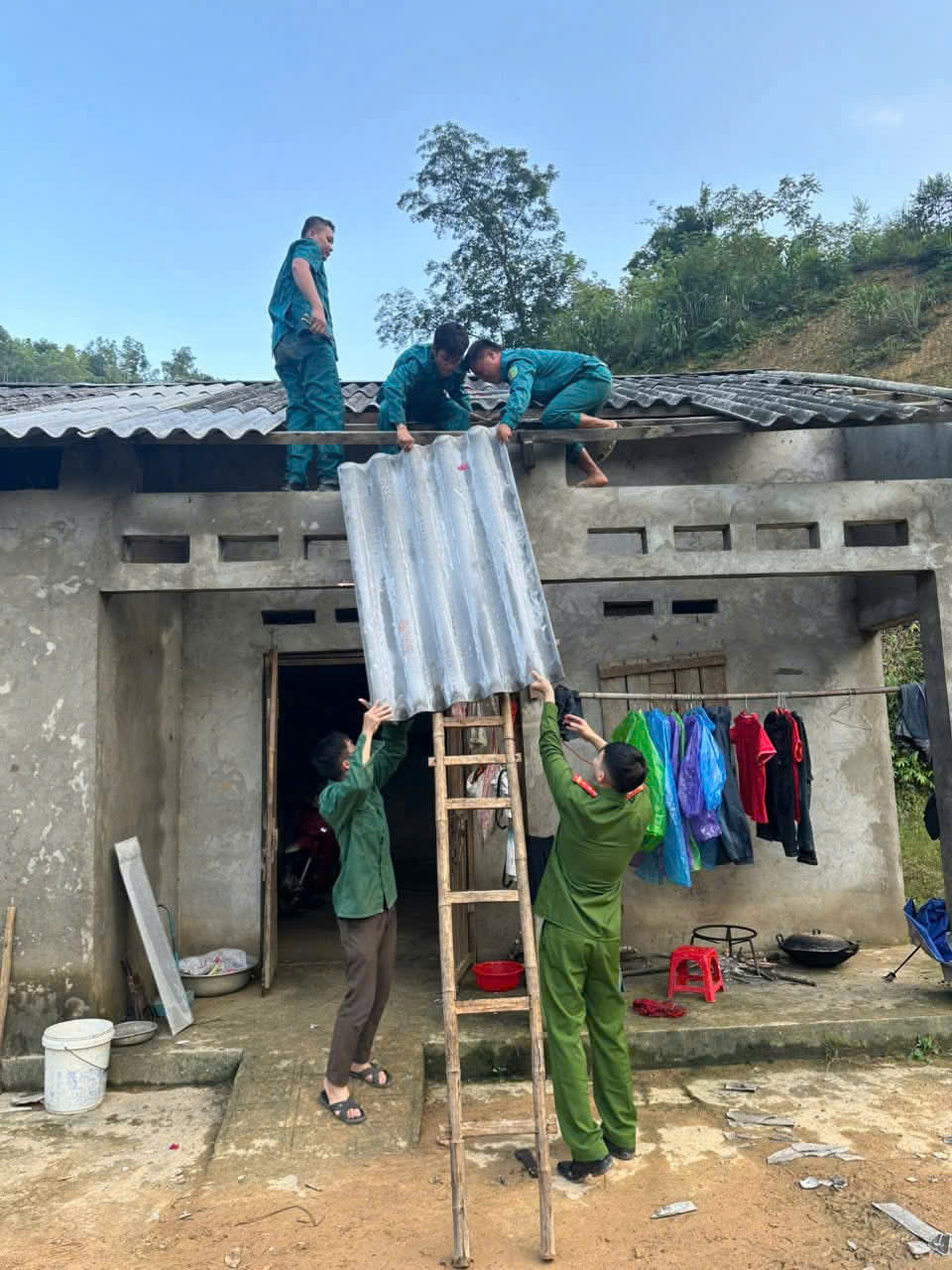 Công an xã Tân Tiến phối hợp với các phòng ban và lực lượng trên địa bàn hỗ trợ người dân khắc phục hậu quả sau bão MATMO