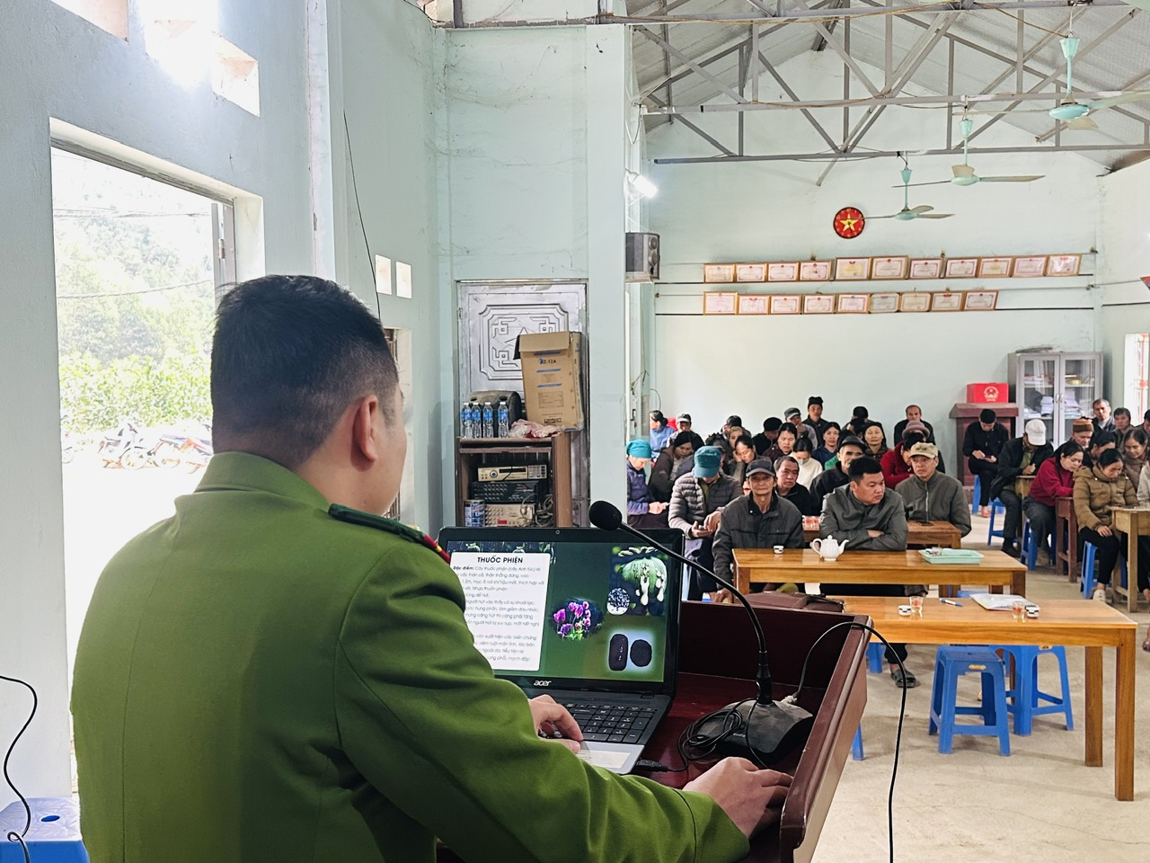 (Cán bộ Công an xã Tân Tiến tuyên truyền tại cuộc họp thôn)