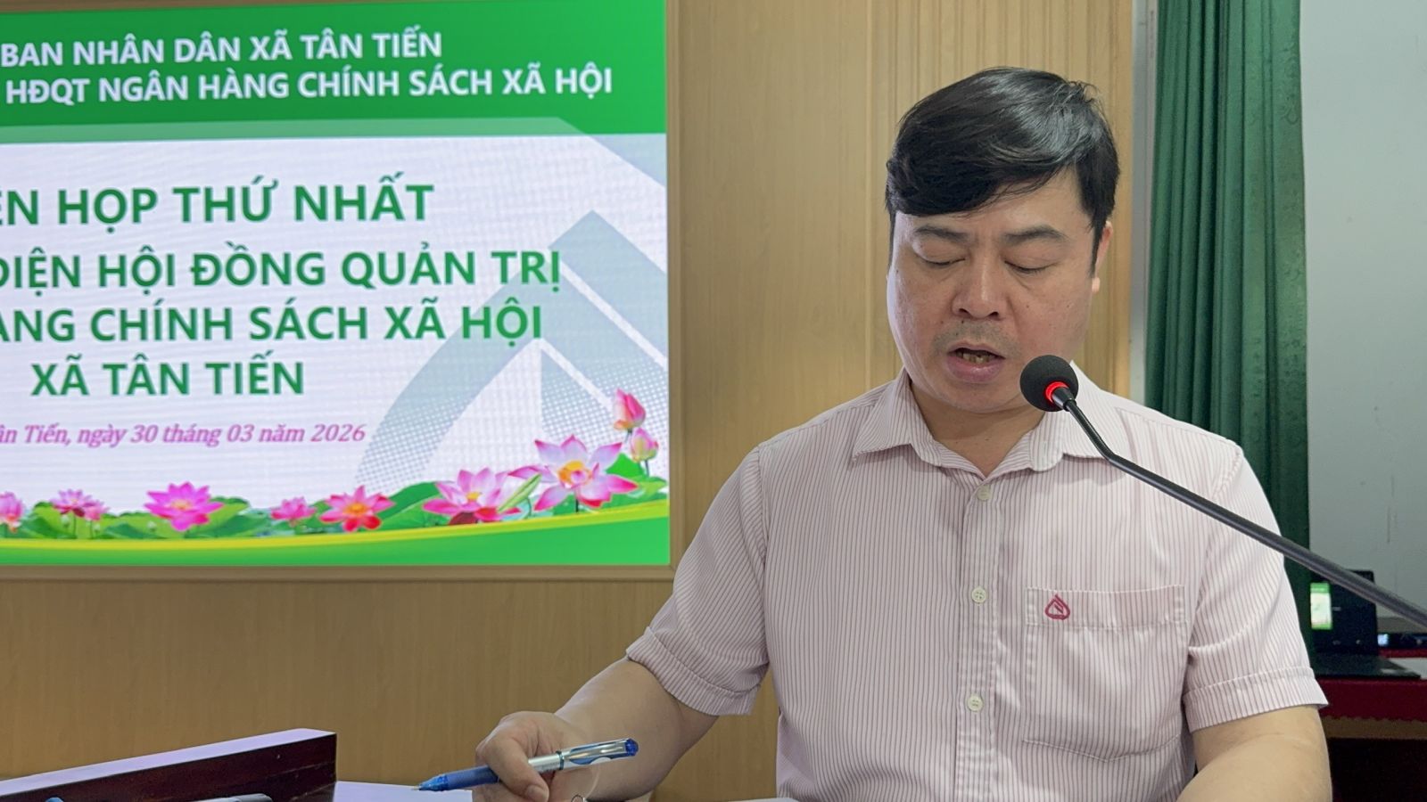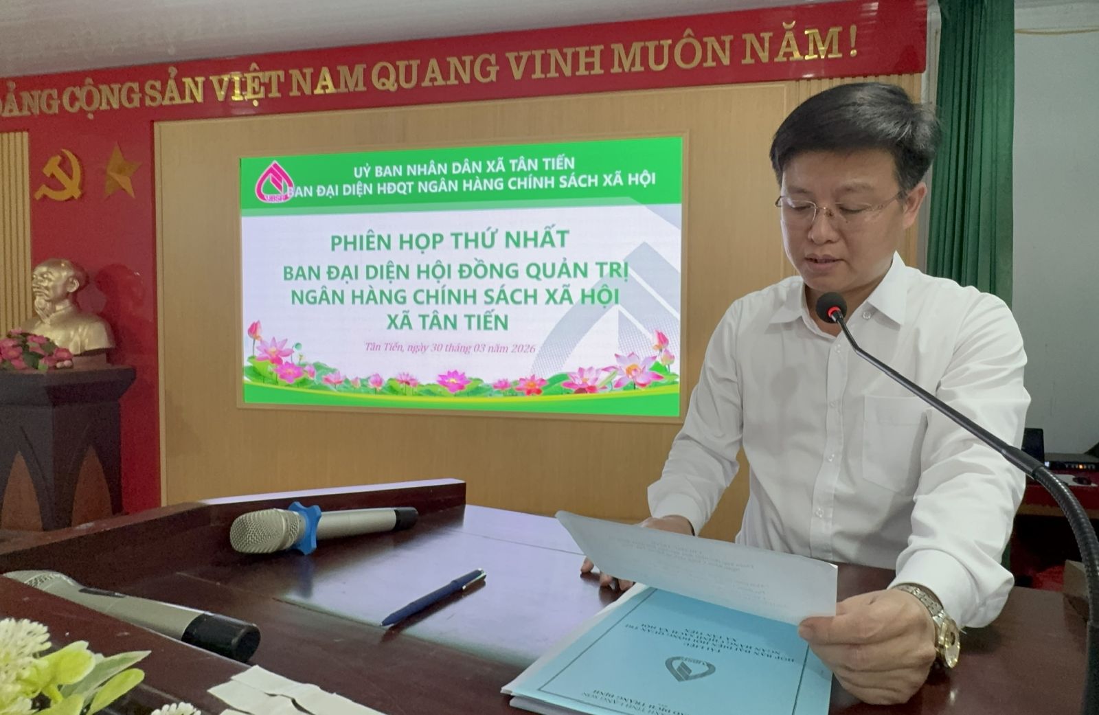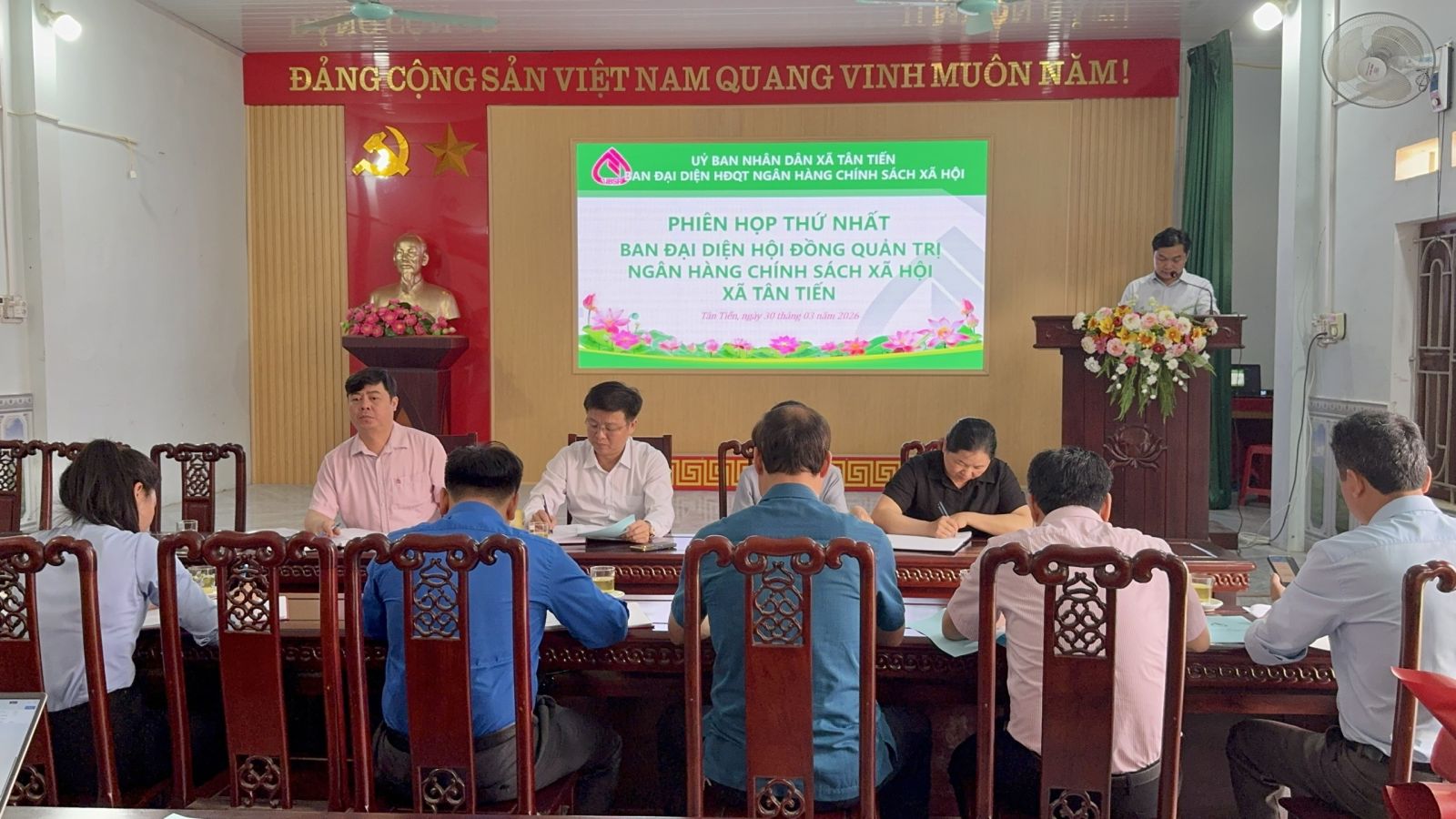 Chiều ngày 30/3/2026, Ban đại diện Hội đồng quản trị, Ngân hàng Chính sách xã hội xã Tân Tiến, tổ chức phiên họp thứ nhất nhằm công bố Quyết định thành lập, Ban đại diện Hội đồng quản trị, Ngân hàng Chính sách xã hội xã. Đồng chí Hoàng Ngọc Hưng, Phó Bí thư Đảng ủy, Chủ tịch UBND xã, Trưởng Ban đại diện Hội đồng quản trị, Ngân hàng Chính sách xã hội xã chủ trì phiên họp.