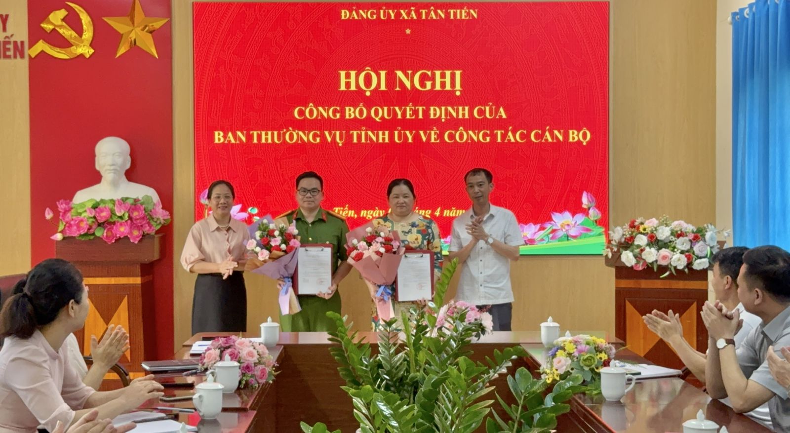 Tại hội nghị, đồng chí Đường Mạnh Hà, Phó Bí thư Thường trực Đảng ủy đã công bố Quyết định của Ban Thường vụ Tỉnh ủy về việc chuẩn y đồng chí Bàn Thị Niệm, Ủy viên Ban Chấp hành Đảng bộ, Phó Chủ tịch HĐND xã tham gia Ban Thường vụ Đảng ủy xã Tân Tiến, nhiệm kỳ 2025–2030. Đồng thời, công bố Quyết định chỉ định đồng chí Thiếu tá Triệu Văn San, Trưởng Công an xã Tân Tiến tham gia Ban Chấp hành, Ban Thường vụ Đảng ủy xã nhiệm kỳ 2025–2030.